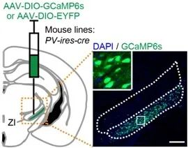在底丘脑的一个叶子形状的核团——未定带(Zona incerta, ZI)内,研究人员对一群小清蛋白(Parvalbumin, PV)阳性的GABA能神经元产生了浓厚兴趣,它们集中位于ZI核团的腹侧。ZI核团有多种神经元亚型,此前的研究表明这一核团可以和脑内其他核团形成广泛的突触联系,与癫痫、防御、进食等行为调节有关,然而ZI在疼痛中的确切作用尚不明确。