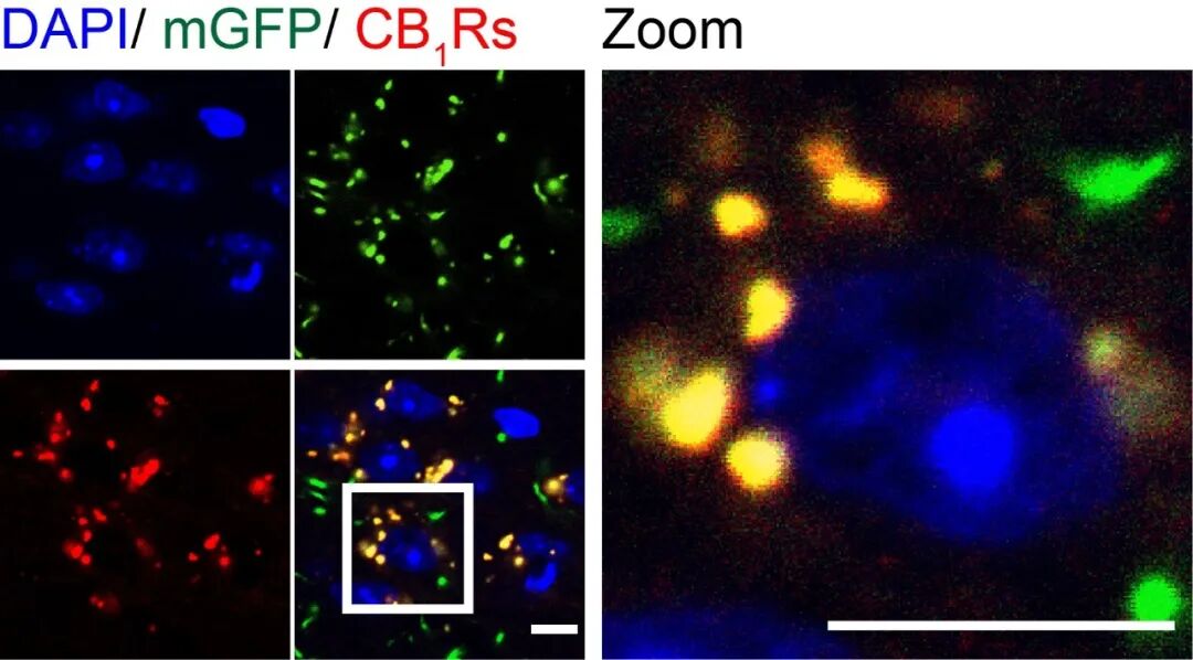 这里的“关键分子”,指的是大麻素1型受体(Cannabinoid type 1 receptors, CB1Rs)。研究人员发现,ZIv-Po神经环路突触前大量表达CB1Rs分子。在这条脑内的痛感“要道”上,大麻素1型受体类似一个调控痛感的“开关”。如果在小鼠Po区域局部注射大麻类药物,可以显著增加小鼠的疼痛阈值;相反,如果Po区域局部给予CB1Rs拮抗剂,小鼠的痛觉敏感性就显著提高。