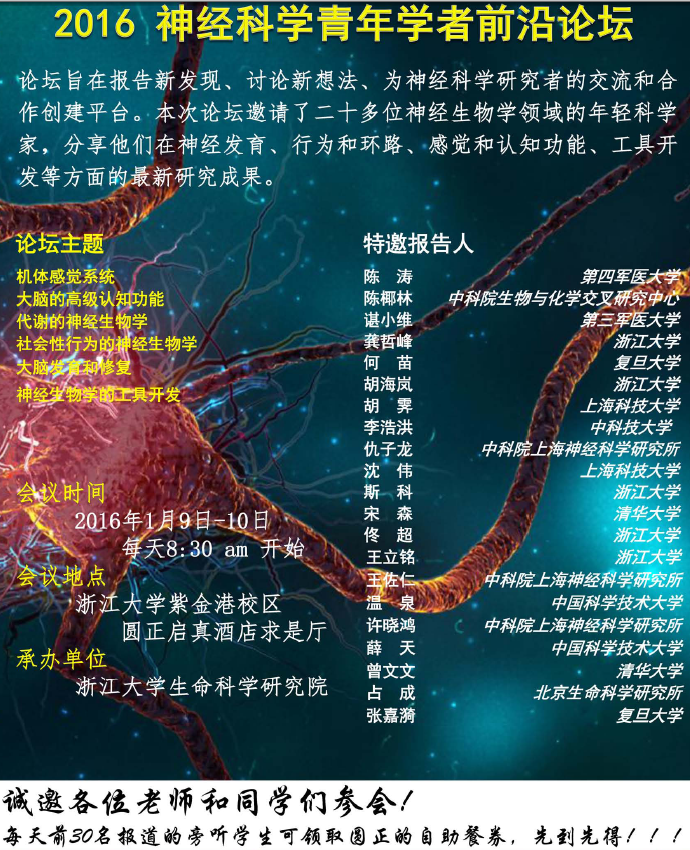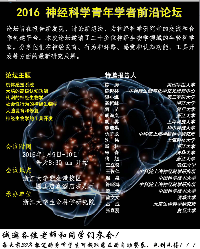 In order to constructing an effective platform for neuroscience researchers to exchange new ideas and extent collaboration, the Life Science Institute of Zhejiang University is going to host a frontier forum of young neuroscientist. The forum will be held from 9th to10th Jan. 2016 in Qiushi Conference Room, Yuangzheng Qizhen Hotel. Over 20 young scientists are invited to share their research experiences in neurodevelopment, brain circuitry and behavior, sense and cognition and developing of new research tools. All are welcome!