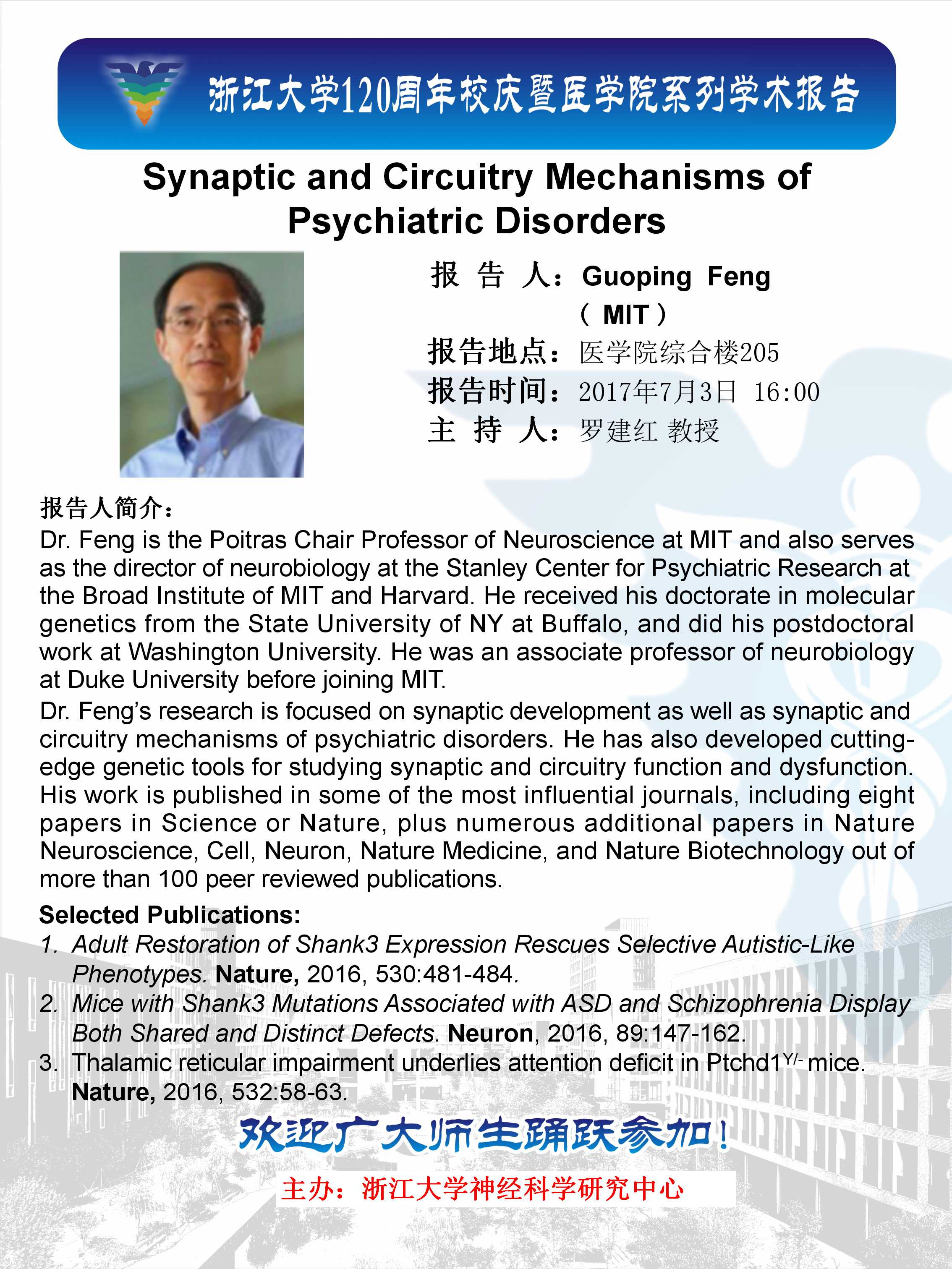 SEMINARS SEMINARS RESEARCH VIDEO Home> SEMINARS Synaptic and Circuitry Mechanisms of Psychiatric Disorders 2017-07-03 Zhejiang University Pageviews: 951