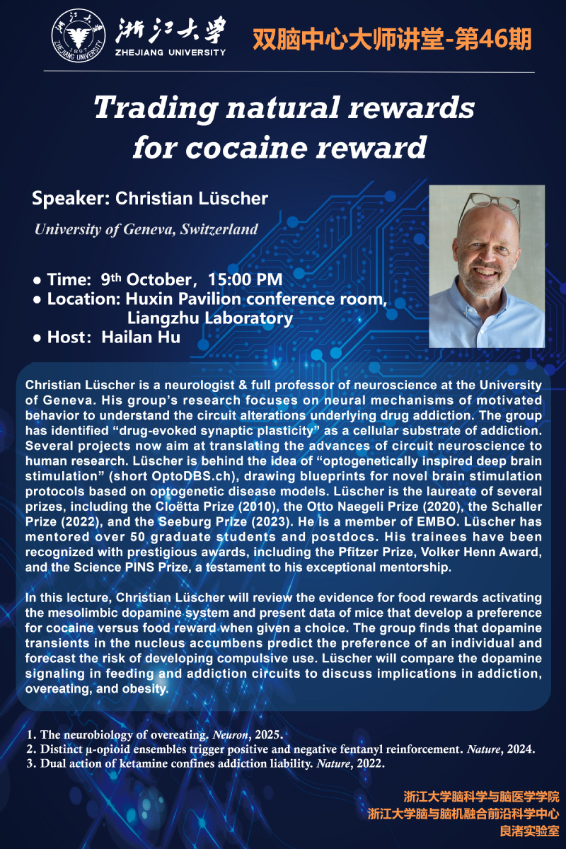 SEMINARS SEMINARS RESEARCH VIDEO Home> SEMINARS Trading natural rewards for cocaine reward 2025-09-30 Zhejiang University Pageviews: 10